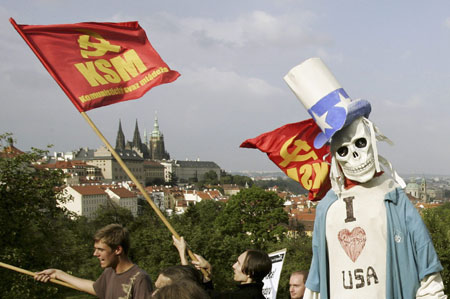 Demonstrator take part in an anti-US protest in Prague June 4, 2007. Hundreds of Czechs protested peacefully on Monday against US plans for a missile defence shield, rallying near Prague's historic castle hours before US President George W. Bush was due to arrive in the capital. [Reuters]