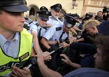 Demonstrators try to remove a police barricade during an anti-US protest in Prague June 4, 2007. Hundreds of Czechs protested peacefully on Monday against US plans for a missile defence shield, rallying near Prague's historic castle hours before US President George W. Bush was due to arrive in the capital. [Reuters]
