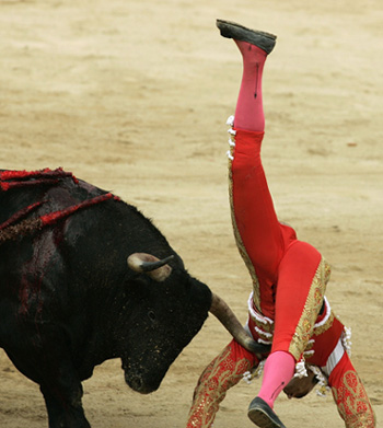 Spanish bullfighter Manuel Jesus also known as "El Cid" is tossed in the air by a bull during a bullfight at the San Fermin festival in Pamplona July 13, 2007. [Reuters]
