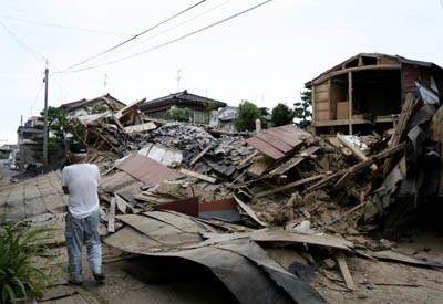 A man walks past a collapsed house in Kashiwazaki, northern Japan, July 16, 2007. A strong earthquake killed at least four people in Japan on Monday, injured more than 400, flattened houses and started a small fire at the world's largest nuclear power plant, Japanese media and officials said. [Reuters]