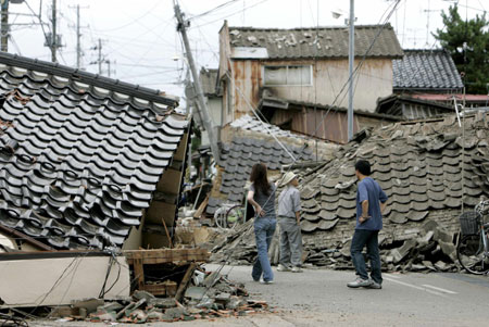 Residents walk among collapsed houses after an earthquake hit Kashiwazaki, northern Japan, July 16, 2007. A strong earthquake killed at least four people in Japan on Monday, injured more than 500, flattened houses and started a small fire at the world's largest nuclear power plant, Japanese media and officials said. [Reuters]