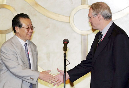 | Chief U.S. nuclear envoy Christopher Hill (R) shakes hands with North