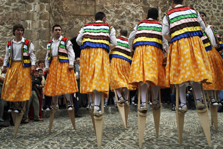 Stilt dancers perform at the start of a procession to celebrate the Feast of Mary Magdalene in the northern Spanish village of Anguiano July 22, 2007. Eight local men on top of wooden stilts and dressed in brightly colored shirts and petticoats escort a figure of Mary Magdalene spinning down the cobbled streets of the village.The tradition has been handed down from father to son for generations and is believed to have begun when shepherds used stilts to traverse their flooded fields. [Reuters]