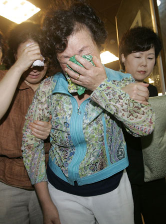 The mother (C) and family members of Sim Sung-min, a 29-year-old man who is one of 22 South Koreans in Afghanistan kidnapped by the Taliban, react after watching television news about Sim in Seongnam, south of Seoul, July 31, 2007. Taliban kidnappers shot dead a male South Korean hostage on Monday, accusing the Afghan government of not listening to rebel demands for the release of Taliban prisoners. The identity of the dead hostage has yet to be officially announced. [Reuters]