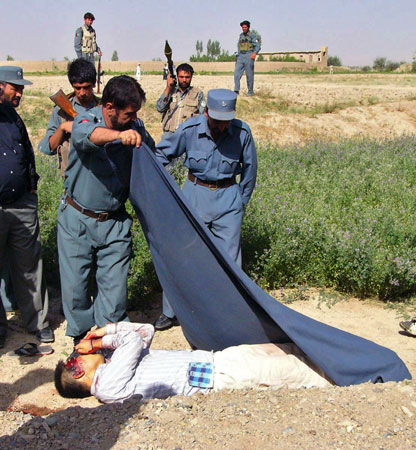 Afghan policemen cover body of the second Korean killed by the Taliban outside Ghazni city south of Kabul July 31, 2007. The second South Korean hostage shot dead by Taliban insurgents in Afghanistan was identified on Tuesday as Shim Sung-min, 29, a former IT firm employee who did volunteer work to help the poor. [Reuters]