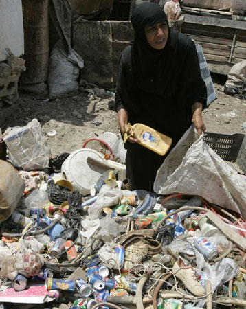 A woman collects junk at a dumpsite in a slum neighbourhood in Baghdad's Sadr City July 31, 2007. About 30 families who live near the dumpsite make their living collecting junk and recyclable materials in Sadr City. [Reuters]