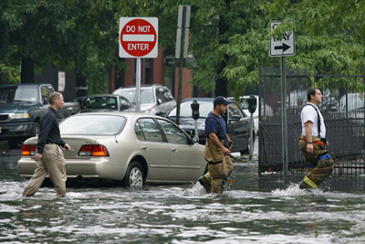 Naturally, the stormwater sought the low ground, and that meant the subways. Water poured in through vents, drowned the signal system and flooded the third rail, forcing a shutoff of power on some lines. MTA Executive Director Elliot G. Sander said the intensity of the rain was simply overwhelming. The subway's drainage system can generally handle a maximum of 1.5 inches of rainfall per hour. "The timing and intensity of the storm took us by surprise," Sander said. The subway problems come as weather experts predict New York is due for a major hurricane. A storm with 130 mph winds and a 30-foot storm surge could cause the Hudson and East rivers to overflow — and bring with it more significant flooding than a severe rainstorm. Keeping the subway system dry is a challenge, even in regular weather. On an average day, hundreds of MTA pumps remove 13 million gallons of water from the system, which includes several tunnels and stations below sea level. Much of that water is groundwater that enters from sources such as streams. Public officials called for improvements in the drainage system after a similar rain-related shutdown in 1999, and the MTA made some changes after another round of paralyzing tunnel floods in 2004, when the remnants of Hurricane Frances washed out the subways for hours. The city's sewer and stormwater drains can handle steady rain, "but when it comes to these very intense, high inch-count rain events, over a short period of time, it is very difficult," said Michael Saucier, a spokesman for the city's Department of Environmental Protection. DEP Commissioner Emily Lloyd said the city is spending $300 million per year upgrading its piping systems and has been gradually building a more robust stormwater drainage system to replace the old combined sewers that handled wastewater and rain. In Manhattan, Times Square was one huge mess Wednesday, packed with many of the 4 million riders who rely on the subway system daily. Thousands waited for hours for any means of transportation, jostling one another to get on the few buses that arrived. The suburbs were no better: In Westchester County, hundreds of commuters were stopped on a Metro-North train due to track flooding. Streams of people in business attire — with briefcases, cell phones and BlackBerries in hand — trudged through drenched streets toward the subway. But it, too, was flooded. The hordes then made a beeline for buses they'd spotted up the street. The storms also created problems for the region's airports, where delays of up to an hour were reported. The National Weather Service said a tornado touched down in Brooklyn, where winds downed trees, tore off rooftops and wrapped signs around posts. At least 40 homes were damaged. Tornadoes have hit New York City before, but not often. The National Weather Service had records of at least five, plus sketchy detail on the last reported tornado sighting in Brooklyn, in 1889. None was as strong as Wednesday's twister, which had winds as high as 135 mph. "It's a once-in-a-lifetime event," said Jeffrey Tongue, a Weather Service meteorologist. A woman on Staten Island died when a car got stuck in an underpass and another car came along and hit hers, Mayor Michael Bloomberg said. A handful of people were injured, Bloomberg said. Lanie Mastellone, who lives in Brooklyn's Bay Ridge neighborhood, awoke as her roof was coming off. Before escaping, she ran to get her late husband's wedding ring. "It happened so quick. Maybe he was watching over me," Mastellone said. At the end of the day, some trains were finally back up and running. But commuters trying to get home were met with another unpleasant surprise: The storm left behind high humidity that felt like they were walking into a sauna — and when they got onto train cars, a sardine can. |