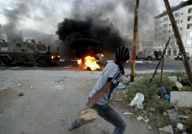 Palestinians throw rocks at an Israeli army armoured vehicle during an army operation in the northern West Bank city of Jenin August 9, 2007. [AP]