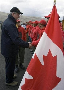 Canada's Prime Minister Stephen Harper poses for a photograph with Arctic Rangers in the Arctic port of Nanisivik, Nunavut, August 10, 2007. [Reuters]