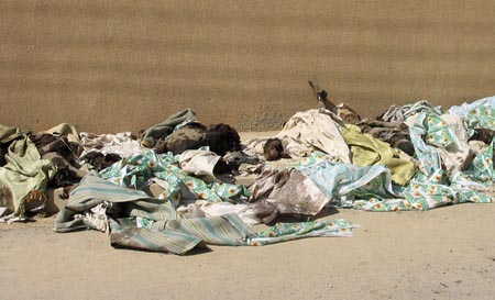 The remains of suicide bomb attack victims are covered with blankets as they lie on a road in the village of Kahtaniya, west of Mosul, August 15, 2007. Rescuers used bare hands and shovels to claw through clay houses shattered by an onslaught of suicide bombings that killed at least 250 in northern Iraq. [Reuters]