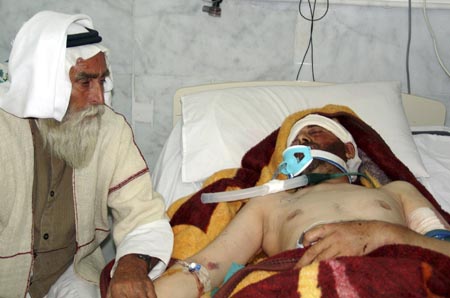 A man sits beside a victim of a suicide bomb attack in a hospital in Dahouk, 430 km (260 miles) northwest of Baghdad, August 15, 2007. Rescuers used bare hands and shovels to claw through clay houses shattered by an onslaught of suicide bombings that killed at least 250 in northern Iraq. [Reuters]