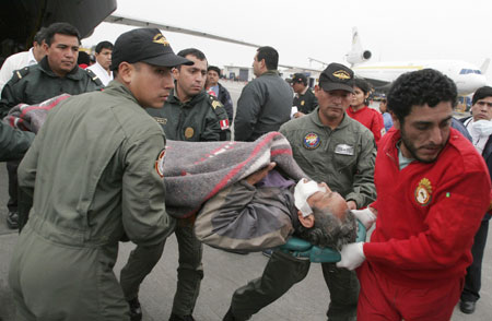 "There has been a good international response even without Peru asking for it, and they've been very generous," Garcia said during a stop in Pisco, where so many buildings fell that streets were covered with small mountains of adobe bricks and broken furniture. The help includes cash from the United Nations, Red Cross, the United States and European Union as well as tents, water, medicine and other supplies. The US Navy hospital ship Comfort, equipped with a staff of 800 and 12 operating rooms, is in Ecuador and could quickly sail to Peru if asked, US officials said. Electricity, water and phone service were down in much of southern Peru. The government rushed police, soldiers and doctors to the area, but traffic was paralyzed by giant cracks and fallen power lines on the Panamerican Highway. Large boulders also blocked Peru's Central Highway to the Andes mountains. Many people said they had seen "lights in the sky," a phenomenon authorities attributed to short circuits at electrical plants where the quake damaged cables and other equipment. In Chincha, a small town near Pisco only 25 miles from the quake's epicenter, an AP Television News cameraman counted 30 bodies in a hospital patio. "Our services are saturated and half of the hospital has collapsed," Dr Huber Malma said as he single-handedly attended to dozens of patients. The quake toppled a wall in Chincha's prison, allowing at least 600 prisoners to flee. Only 29 had been recaptured, national prisons official Manuel Aguilar said. Overstretched police and rescue workers in orange uniforms sought to help survivors trying to get some sleep in the streets amid collapsed adobe homes. "We're all frightened to return to our houses," Maria Cortez said, staring vacantly at the half of her house that was still standing. The Peruvian Red Cross arrived in Ica and Pisco 7 1/2 hours after the quake, about three times as long as it would normally have taken because of road damage, Red Cross official Giorgio Ferrario said. In Lima, 95 miles from the epicenter, only one death was recorded. But the furious two minutes of shaking prompted thousands to flee into the streets and sleep in public parks. "The earth moved differently this time. It made waves and the earth was like jelly," said Antony Falconi, 27, trying to find a bus to take him home. Scientists said the quake was a "megathrust" - a type of earthquake similar to the catastrophic Indian Ocean temblor in 2004 that generated deadly tsunami waves. "Megathrusts produce the largest earthquakes on the planet," said USGS geophysicist Paul Earle. Wednesday's quake caused a tsunami as well. Small tsunami waves traveled across the Pacific and reached Japan, 10,000 miles away, on Friday. Beaches were closed along Japan's Pacific coast because of the waves, which were no more than 8 inches. In general, magnitude 8 quakes are capable of causing tremendous damage. Quakes of magnitude 2.5 to 3 are the smallest generally felt, and every increase of one number on the magnitude scale means that the quake's magnitude is 10 times as great. The temblor occurred in one of the most seismically active regions in the world at the boundary where the Nazca and South American tectonic plates meet. The plates are moving together at a rate of 3 inches (7.5 cms) a year, Earle said. The last time a quake of magnitude 7.0 or larger struck Peru was in September 2005, when a 7.5-magnitude earthquake rocked the country's northern jungle, killing four people. In 2001, a 7.9-magnitude quake struck near the southern Andean city of Arequipa, killing 71. |