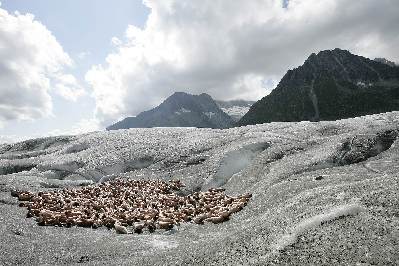 Naked volunteers pose for US photographer Spencer Tunickon the Aletsch glacier August 18, 2007. Tunick held the photo session for a Greenpeace campaign which symbolizes highlighting climate change. [Reuters]