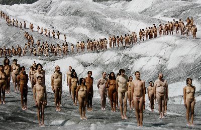 Naked volunteers pose for US photographer Spencer Tunickon the Aletsch glacier August 18, 2007. Tunick held the photo session for a Greenpeace campaign which symbolizes highlighting climate change. [Reuters]