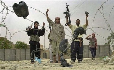 Mahdi Army Militia men gesture in the Shiite holy city of Najaf , 160 kilometers (100 miles) south of Baghdad, Iraq, in this Friday, May 28, 2004 file photo. Rivalries and violence between Shiite factions are threatening to overshadow progress US forces have made against al-Qaida in Iraq and other extremists just weeks before the top American commander and diplomat in Iraq report to Congress. [AP] |
