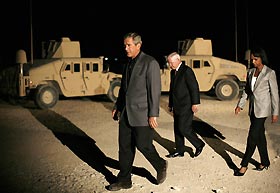 Bush secretly flew 11 hours to this air base in a remote part of Anbar province, bypassing Baghdad in a symbolic expression of impatience with political paralysis in the nation's capital. The gesture underscored the US belief that the spark for progress may come at the local level. Defense Secretary Robert Gates arrived ahead of Bush and conferred with senior US officials, including Gen. David Petraeus and US ambassador to Iraq Ryan Crocker, before a session with Prime Minister Nouri al-Maliki, President Jalal Talabani, and other top Iraqi officials from Baghdad. To a large degree, the setting was the message: Bringing al-Maliki, a Shiite, to the heart of mostly Sunni Anbar province was intended to show the administration's war critics that the beleaguered Iraqi leader is capable of reaching out to Sunnis, who ran the country for years under Saddam Hussein. Bush has held up Anbar as an example of recent progress, especially on the security front, although the province is still economically deprived and not yet stable enough to turn over to full Iraqi control. Next week, Petraeus, the top US commander in Iraq, and Crocker testify before Congress. Their assessment of the conflict, along with a progress report the White House must give lawmakers by September 15, will determine the next chapter of the war. The United States cannot sustain the troop buildup indefinitely. And with Democrats calling for withdrawals and a rising US death toll that has topped 3,700, the president is hardpressed to give al-Maliki much more time to find a political solution to the fighting. Bush stopped in Iraq ahead of his visit to Australia for an economic summit with Asia-Pacific leaders. The trip was a closely held secret for obvious security reasons, although speculation about the trip arose late last month when first lady Laura Bush said she was staying home to tend to a pinched nerve in her neck. The president, who also went to Iraq at Thanksgiving 2003 and in June 2006, was scheduled to leave for Australia on Monday, but Air Force One took off from Andrews Air Force Base Sunday evening instead. He was joined by his top advisers, including National Security Adviser Stephen Hadley. Joining Gates were Gen. Peter Pace, chairman of the Joint Chiefs of Staff, and Adm. William Fallon, the top US commander in the Middle East. Fallon flew aboard Gates' Air Force plane from Washington. Pengon press secretary Geoff Morrell said the session at al-Asad would be the last big gathering of the president's war advisers with Iraqi leaders before he makes a decision on a way forward in Iraq. The White House arranged Bush's trip at a pivotal juncture in the Iraq debate. Some prominent Republican lawmakers have broken with Bush on his war strategy, but so far, most Republicans have stood with Bush. In exchange for their loyalty, they want to see substantial progress in Iraq soon. |