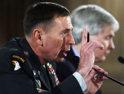 | US Army General David Petraeus (L), the top commander of US forces in Iraq, gestures as he testifies about the war in Iraq with US Ambassador to Iraq Ryan Crocker (R) during a joint hearing of the US House Armed Services Committee and the House Foreign Affairs Committee on Capitol Hill in Washington, September 10, 2007. [Reuters] |