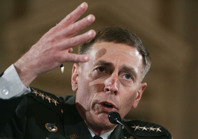 | US Army General David Petraeus, the top commander of US forces in Iraq, testifies about the war in Iraq during a joint hearing of the US House Armed Services Committee and the House Foreign Affairs Committee on Capitol Hill in Washington, September 10, 2007. [Reuters] |