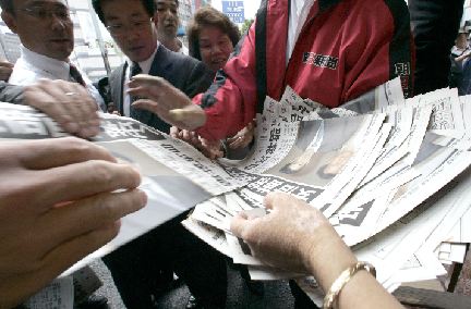 | People reach out to receive a copy of a special edition paper reporting Japanese Prime Minister Shinzo Abe's decision that he would resign in Tokyo September 12, 2007. Embattled Abe struggling after a bashing at the polls and suffering low support rates, said on Wednesday that he would resign. [Reuters] |