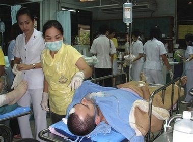 An injured foreign passenger from a plane crash is treated at a hospital in Phuket, southern Thailand Sunday, September 16, 2007. A passenger plane with 130 passengers and 5 crew members crashed while attempting to land at southern Thailand's Phuket airport Sunday afternoon, killing 88 and injuring 42. [AP]