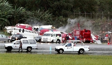 The wreckage of a One-Two-Go passenger plane sits on the site of the Phuket airport after it crashed while attempting to land on Sunday Sept. 16, 2007 in Phuket, southern Thailand. [AP]