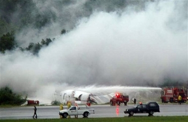 Thai firefighters and rescuers try to put off the fire and help passengers out of a plane that crashed while about to land at Phuket international airport in Phuket, southern Thailand Sunday, Sept. 16, 2007. [AP]