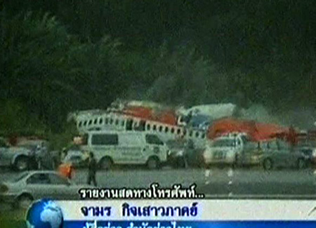 Rescue vehicles surround the wreckage of a crashed Thai airliner in Phuket in this September 16, 2007 video grab. [Reuters]