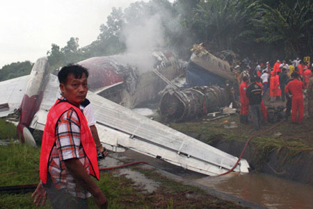 Rescue workers stand near the site of a plane which crashed at the Phuket airport September 16, 2007. [Reuters]
