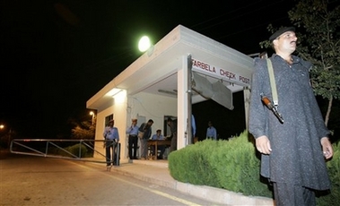 Pakistani security personnel stand alert at a check post near the headquarters of an anti al-Qaida Special Operation Task Force where a suicide bomber blew himself up in Ghazi Tarbela, about 100 kilometers south of Islamabad, Sept. 14, 2007. [AP]