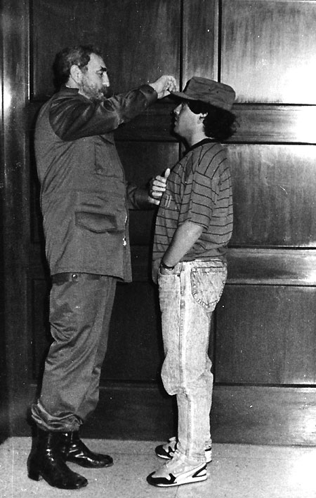 Cuba's leader Fidel Castro gives his cap to Argentinian soccer star Diego Maradona at the Revolution Palace in Havana in this July 28, 1987 file photo. Castro may have dropped out of sight, but his trademark green military cap is everywhere. Nearly 49 years after Castro's socialist revolution, the Fidel cap is selling like hot cakes to tourists visiting Cuba, and more and more young Cubans are also snatching them up. [Reuters] |