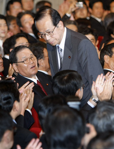 | Former chief cabinet secretary Yasuo Fukuda (C) bows to parliamentarians of the ruling Liberal Democratic Party (LDP) after he was chosen as the party president at the LDP parliamentarian meeting, at the party headquarters in Tokyo September 23, 2007. The LDP picked Fukuda, an advocate of warmer ties with Tokyo's Asian neighbours, to succeed Shinzo Abe as prime minister in an effort to revive party fortunes and end a political vacuum. [Reuters] |