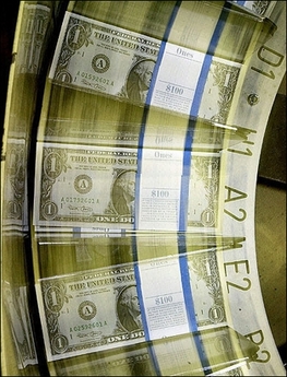 Bundles of US dollar bills are moved through the wrapping machine at the Bureau of Engraving and Printing in Washington, DC.  [AFP]
