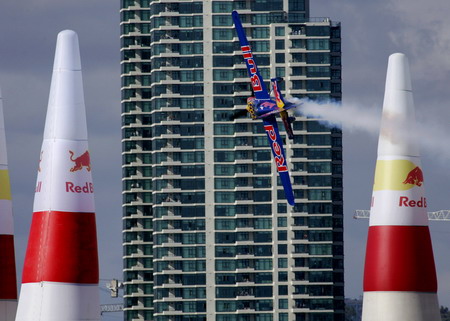 US pilot Kirby Chambliss of Team Red Bull flies during the ninth stage of the Red Bull Air Race World Series in San Diego September 22, 2007. [Reuters]