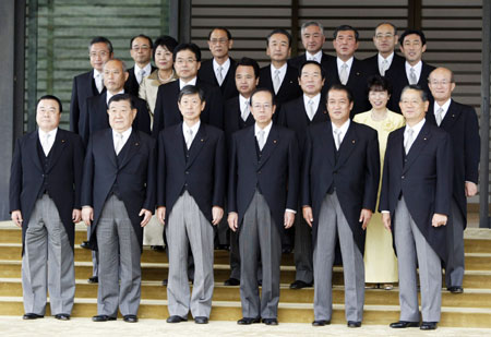 Japan's newly elected Prime Minister Yasuo Fukuda (front 3rd R), newly appointed Chief Cabinet Secretary Nobutaka Machimura (front R) and other cabinet members pose for a photo session after attending an attestation ceremony at the Imperial Palace in Tokyo September 26, 2007. [Reuters]