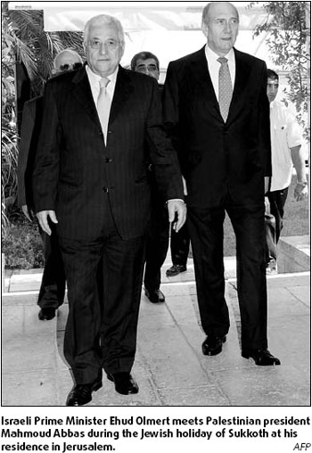 Updated: 2007-10-04 08:58 Deeply divided on key issues, the Israeli and Palestinian leaders yesterday started talking about reaching a joint vision of Mideast peace - and putting it down on paper - in time for next month's US-sponsored Mideast conference. Israeli Prime Minister Ehud Olmert hosted Palestinian President Mahmoud Abbas at his official residence in Jerusalem. The two men shook hands and Olmert gave Abbas a brief tour of his sukka, a traditional hut in which Jews eat during the weeklong Sukkot holiday that ends today.