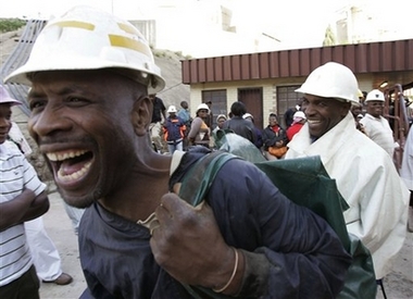 "We can only be grateful and satisfied that not one single life was lost," Soares said. "Spirits are high and we are all very pleased." Waiting their turn to get out, the miners gathered near a ventilation shaft, and the company lowered water and food to them. The miners were trapped when a pipe carrying pressurized air exploded and tumbled into the elevator shaft Wednesday morning, breaking electricity lines powering the main elevator. Some of the 3,200 men and women stranded had entered the mine for the Tuesday night shift. A smaller elevator cage had to be rigged to raise the miners out another shaft, and the first group reached the surface about 1 a.m. Thursday. The company had expected the rescue to take 10 hours in all, but it lasted nearly twice that long.