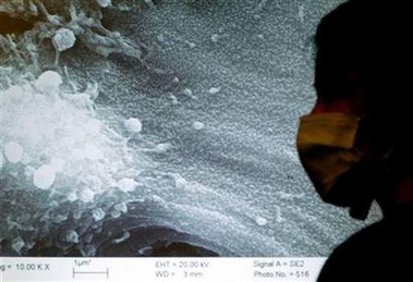 A reporter sits in front a projected image showing virus infected cells inspected under a microscope during a news conference in Hong Kong, in this March 27, 2003 file photo. [Agencies]
