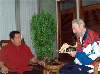 In this photo released by Cuba's Juventud Rebelde newspaper, President Fidel Castro reads a book accompanied by Venezuelan President Hugo Chavez during a meeting in Havana, Saturday, Oct.12, 2007. Chavez met for more than four hours with Fidel Castro and state media on Sunday published two new official photos of the men together, but provided no new details about the ailing Cuban leader's health. [Agencies]