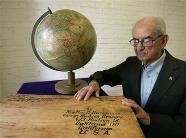Hitler was dead, and other soldiers had already looted the inside of his private residence, even stripping the leather from furniture. Nearly everything of value was gone -- except for the Fuhrer's globe. "Literally, the place is all bombed out and here this globe is sitting there on the desk," said John Barsamian, now 91. Now Barsamian is putting the artifact up for auction, along with all the military paperwork that allowed him to bring it back to the United States, including a certificate that reads "1 Global Map, German, Hitler's Eagle Nest." Other globes presumed to have been owned by Hitler have been extensively researched for authenticity. But there is no uncertainty about the origins of Barsamian's wartime trophy. "This is probably the most airtight documentation I've run across in some time," said Greg Martin, proprietor of the auction house that will handle the sale. "We have pictures of the guy there at the time, standing in the ruins holding the globe like a newborn baby. The guy is a meticulous record keeper." Barsamian found the globe in May 1945 in the Berghof, Hitler's home in the Bavarian Alps town of Berchtesgaden. He boxed it up with a few other keepsakes, including a pistol and a dagger, and shipped them home. For more than 60 years, he kept the globe at his home in Oakland. It wasn't displayed prominently, and he only told its story when close friends would ask. "Hardly anyone knew I had it," Barsamian said. Today, the globe rests on a plain wooden pedestal and wouldn't seem out of place in a grade-school classroom. A weathered ribbon of transparent tape encircles the globe at its equator. For Barsamian, it evokes memories of another era, when he was a 28-year-old chief warrant officer. Running his finger across a World War II-era map of Europe, he described his division's advance into Nazi territory and recalls every battle. "This is where we cleaned out the enemy," Barsamian said, tracing a line eastward from Normandy. But the war was also a painful time. "I lost those years," he said. "Those years with my father and mother and brothers are gone." After beating cancer and burying his wife, Viola, in 2004, Barsamian is finally ready to part with the globe. He's selling it now, while he's still alive, so he can personally tell the story behind it and share his experience in the war, says his son, Barry. The globe to expected to attract bids from $15,000 to $20,000 when it is auctioned Nov. 13 in San Francisco. Other items up for auction include rare documents signed by Hitler, and a box of cigars that belonged to Hermann Goering, a leader in the Nazi Party. |