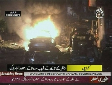 This is a frame from TV moments after an explosion went off near the vehicle carrying former premier of Pakistan Benazir Bhutto , during a parade in Karachi, Pakistan, Thursday, Oct. 18 2007. [Agencies]