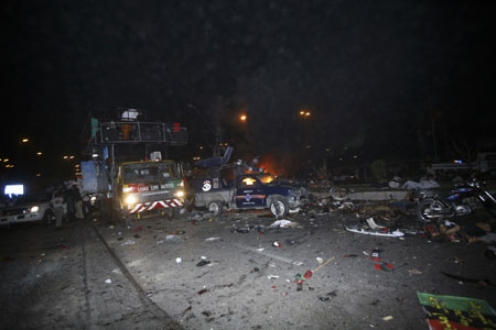 Damaged vehicles and bodies are seen scattered next to a truck (L) which carried Pakistan's former Prime Minister Benazir Bhutto during her welcome rally in Karachi October 19, 2007. [Agencies]