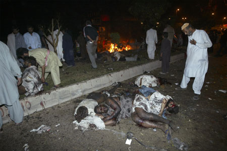 Bodies lie at the scene of explosions which hit former Prime Minister Benazir Bhutto's convoy in Karachi October 19, 2007. [Agencies]