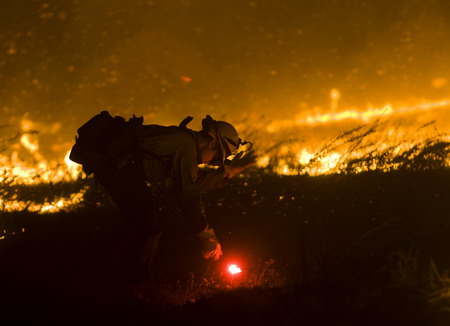 A firefighter sheilds his face while lighting backfires at the Witch Creek Fire which has been fuelled by dry Santa Ana winds and has burned more than 10,000 acres and numerous structures east of Ramona, California October 21, 2007. Ramona is in the eastern part of San Diego County. [Agencies]
