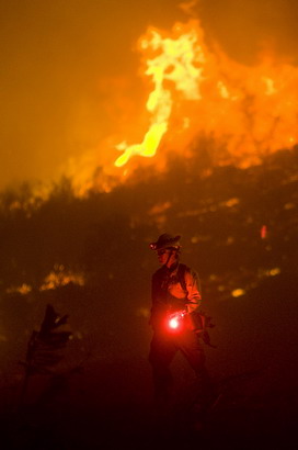 A firefighter walks with a flare to light backfires at the Witch Creek Fire which has been fueled by dry Santa Ana winds and has burned more than 10,000 acres and numerous structures east of Ramona, California October 21, 2007. Ramona is in the eastern part of San Diego County. [Agencies]