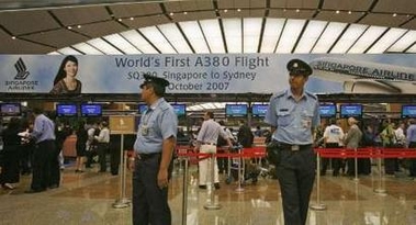 Security staff patrol the check-in area before the Airbus A380 superjumbo took off from Singapore's Changi Airport October 25, 2007. The world's biggest jumbo jet was set to fly from Singapore on Thursday on its long-delayed first-ever commercial flight, SQ380, as part of the Singapore Airlines daily service to Sydney. [Agencies]