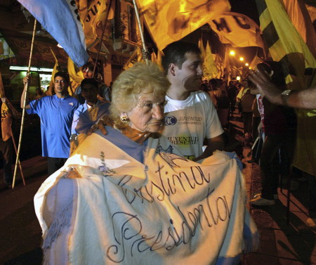 Supporters of first lady and presidential candidate senator Cristina Fernandez de Kirchner react after they learned that Fernandez won Argentina's presidential election outside her campaign headquarters in Buenos Aires October 28, 2007. Fernandez swept to victory in Argentina's presidential vote on Sunday to become the first woman elected to lead the country, television exit polls showed. [Agencies]