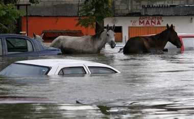 Stranded horses stand amongst submerged cars in flooded Villahermosa in Mexico's Gulf coast, November 2, 2007. Hundreds of thousands of Mexicans fled the flooded region of the swampy Gulf coast Friday. [Agencies]