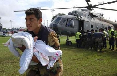 Navy personnel evacuate a baby after she was rescued in Villahermosa, the state capital of Tabasco in southeastern Mexico November 2, 2007. Thousands of homes were flooded after several rivers burst their banks in the southern Mexican state of Tabasco and heavy rains left 70 percent of the swampy region under water. [Agencies]