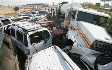 Eighteen big rigs were involved in the massive pileup on Highway 99 just south of Fresno as patches of dense fog obscured visibility on the heavily traveled roadway, CHP officials said. "It looked like something out of a movie, walking up and seeing all the cars mangled and crushed," CHP Officer Paul Solorzano Jr. said. A 6-year-old boy and a 28-year-old man traveling in separate vehicles were killed in the chain-reaction collisions around 7:45 a.m., he said. "There was probably 2-foot visibility in the fog when I got here. It was really bad," said Mike Bowman, a spokesman for the California Department of Forestry and Fire Protection. "It looked like chaos. Cars were backed up on top of each other." Rescuers had to extract several people from the wreckage, and paramedics took more than three dozen patients to the hospital with injuries, Fresno Fire Department spokesman Ken Shockley said. "Everybody was trying to miss everybody, but it was impossible not to get hit," said Cindy Ramirez, 21, of Selma, whose purple Mazda pickup truck was rear-ended. "I'm fine physically, but I keep thinking about all of the things that could have happened." Hours after the accident, the freeway was littered with smashed cars and trucks, broken glass, auto parts and blood. A big rig carrying stacked crates of live turkeys was stranded on the normally busy highway. Crash victims gathered on the freeway shoulder near the wreckage, waiting to be interviewed by investigators. The freeway's northbound lanes were shut down indefinitely as investigators worked to determine the cause of the crash. Traffic backed up for miles south of the wreckage. Southbound lanes remained opened. Thick seasonal fog known as "Tule fog" typically occurs in Central California in the late fall and winter. A stretch of the highway several miles south was the scene of an autumn 74-car pileup nearly a decade ago that left two people dead. |