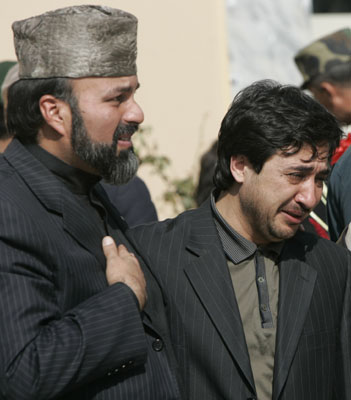 Updated: 2007-11-07 22:39 ![]() Relatives of one of the six Afghan members of parliament, victims in Tuesday's suicide bombing, grieve after the coffins were brought into the capital Kabul, November 7, 2007. Afghans began three days of national mourning on Wednesday for 41 people, many of them children, killed in the country's worst suicide attack. [Agencies] |